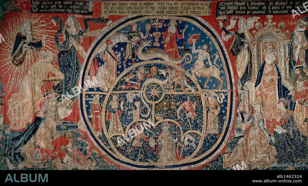 Tapestry of the Astrolabes. 15th century. Flemish tapestry depicting, on the left, God the Creator. In the center, the Vault of Heaven like an astrolabe with Pole Star and the different constellations and two mythological heroes. On the right, enthroned Philosophy, Arithmetic, Geometry and Astronomy, the poet Virgil and the astronomer Hipparchus. From the Toledo Cathedral. Museum of the Holy Cross. Toledo. Castile-La Mancha. Spain.
