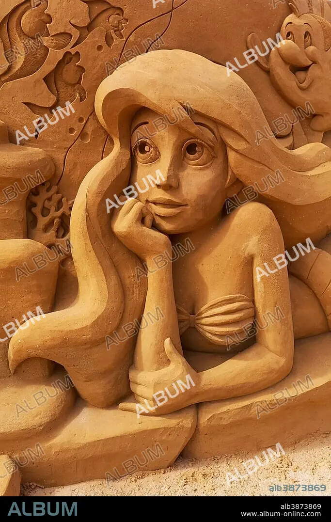 Woman with long hair, sand sculpture, mermaid from the Disney cartoon Arielle sand sculptures festival Frozen Summer Sun, Oostende, West Flanders, Belgium