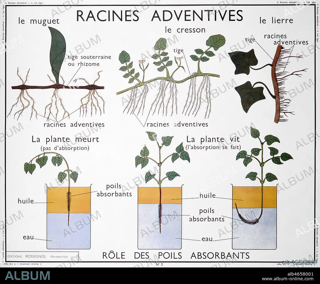 Planche botanique : 'Racines adventives du muguet, du cresson et du lierre et role des poils absorbants'. Panneau scolaire des editions Rossignol des annees 1950. Credit: Imagerie Rossignol/KHARBINE-TAPABOR..