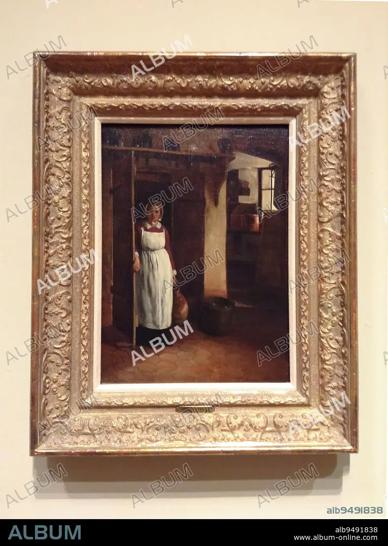Up from the Cellar (La Sortie de la cave), 1857, François Bonvin, French, Paris 1817Saint-Germain-en-Laye 1887, 17 1/2 × 13 in. (44.5 × 33 cm), Oil on canvas, France, 19th century, François Bonvins paintings, drawings, and prints often depicted women doing chores. We see them pouring water from pitchers, cutting bread for the family meal, ironing, or, as in this painting, fetching a container of wine. The setting is likely one Bonvin knew by heart: the background resembles the inn owned by his father in Vaugirard, just outside Paris.