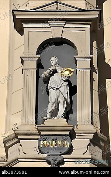 Statue of Prudentia, the goddess of wisdom, on the baroque facade of the city hall, 1704, Am Markt square 1, Lueneburg, Lower Saxony, Germany, Europe, PublicGround, Europe.