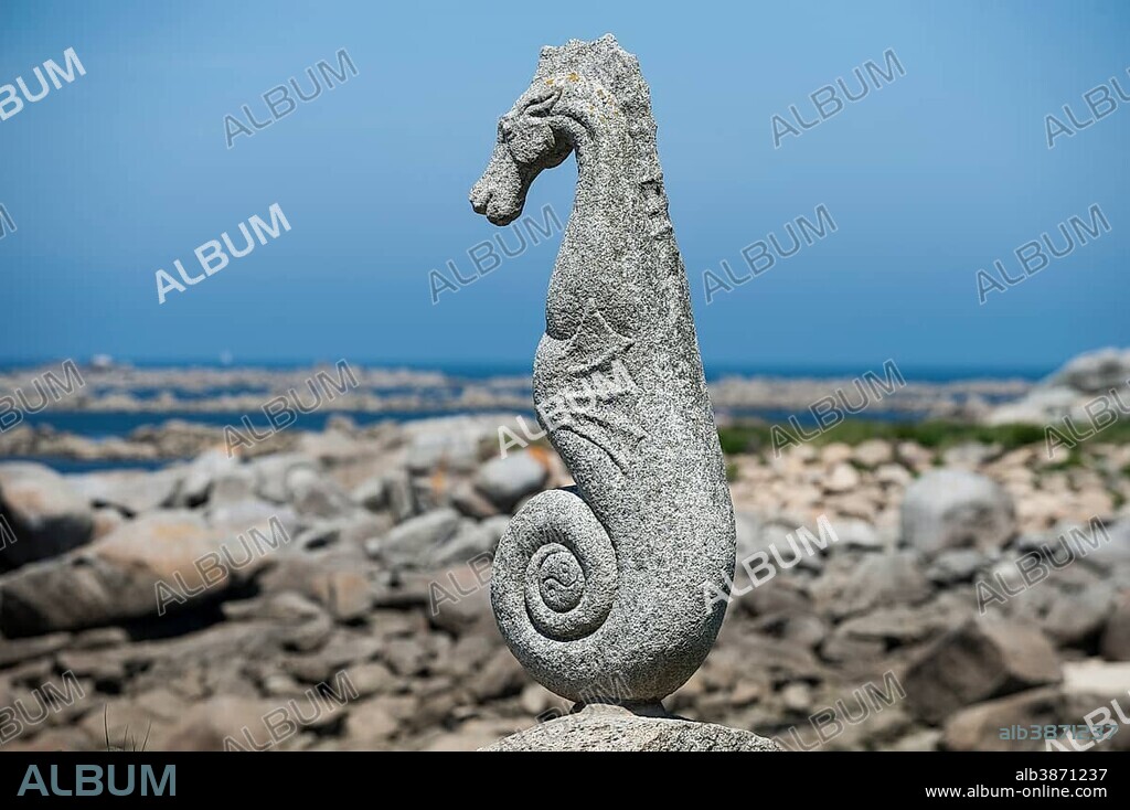 Sculpture of a seahorse, Plouescat, Côte des Abers, Brittany, France, Europe.