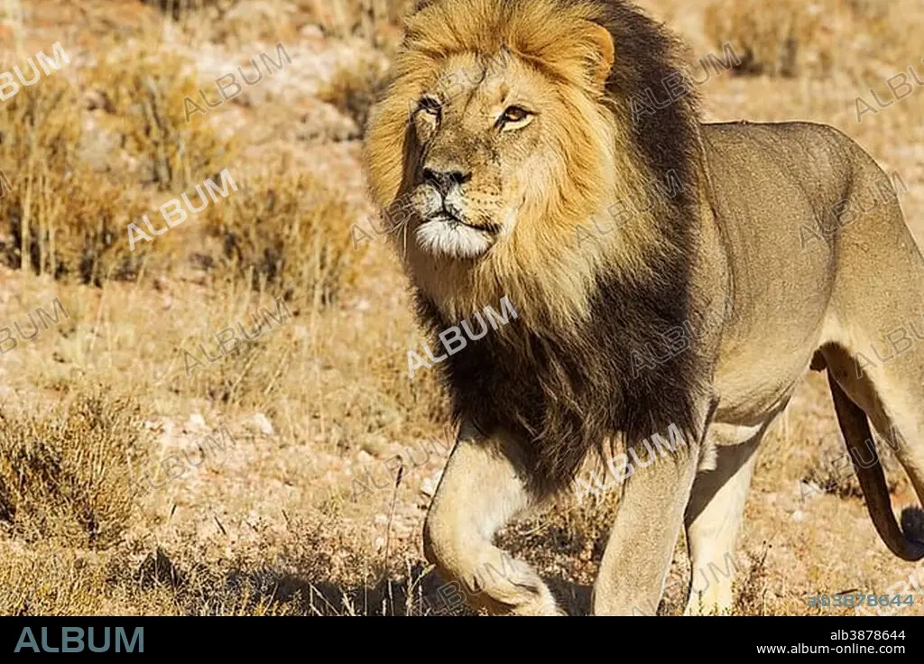 Black-maned Lion (Panthera leo vernayi), male, roaming, Kalahari Desert, Kgalagadi Transfrontier Park, South Africa, Africa.