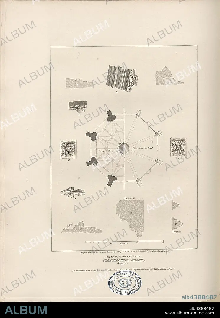 Plan, Ornaments etc. of Chichester Cross, Sussex, Floor plan and details of the Chichester Market Cross in Chichester, signed Engraved by John Roffe, from a Drawing by J. A. Repton, Fig. 37, p. 18, Repton, John Adey, (Drawing); Roffe, Richard (engr.), 1806, John Britton: The architectural antiquities of Great Britain: represented and illustrated in a series of views, elevations, plans, sections and details of various ancient English edifices: with historical and descriptive accounts of each. Bd. 1. London: J. Taylor, 1807-1826.