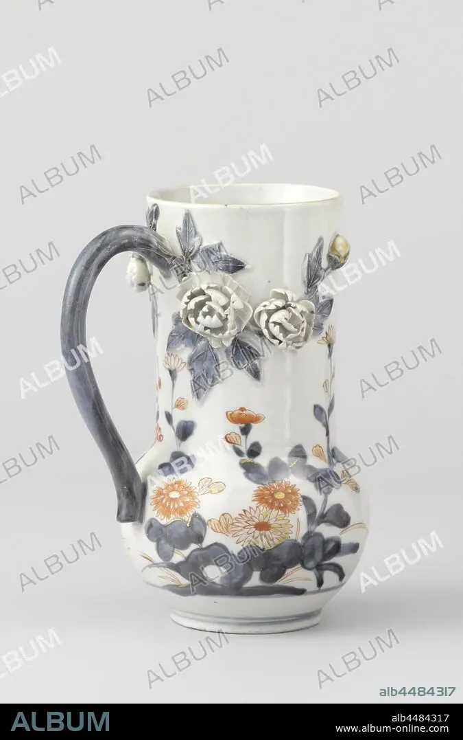 Beer mug with flower sprays and the handle sprouting two flower sprays in relief, Porcelain beer tank with printed spherical body and a wide, long neck, painted in underglaze blue and on the enamel red and gold. On the outside wall on the underside a painted prunus tree, chrysanthemum, lotus and grasses. The S-shaped ear is modeled in the shape of a peony branch, two twigs with flowers embossed on the neck. The neck with the letter 'B' in a medallion. European form in Imari., anonymous, Japan, c. 1700 - c. 1720, Edo-period (1600-1868), porcelain (material), glaze, cobalt (mineral), gold (metal), vitrification, h 16.3 cm d 7.2 cm d 10.5 cm d 6 cm l 11.5 cm.