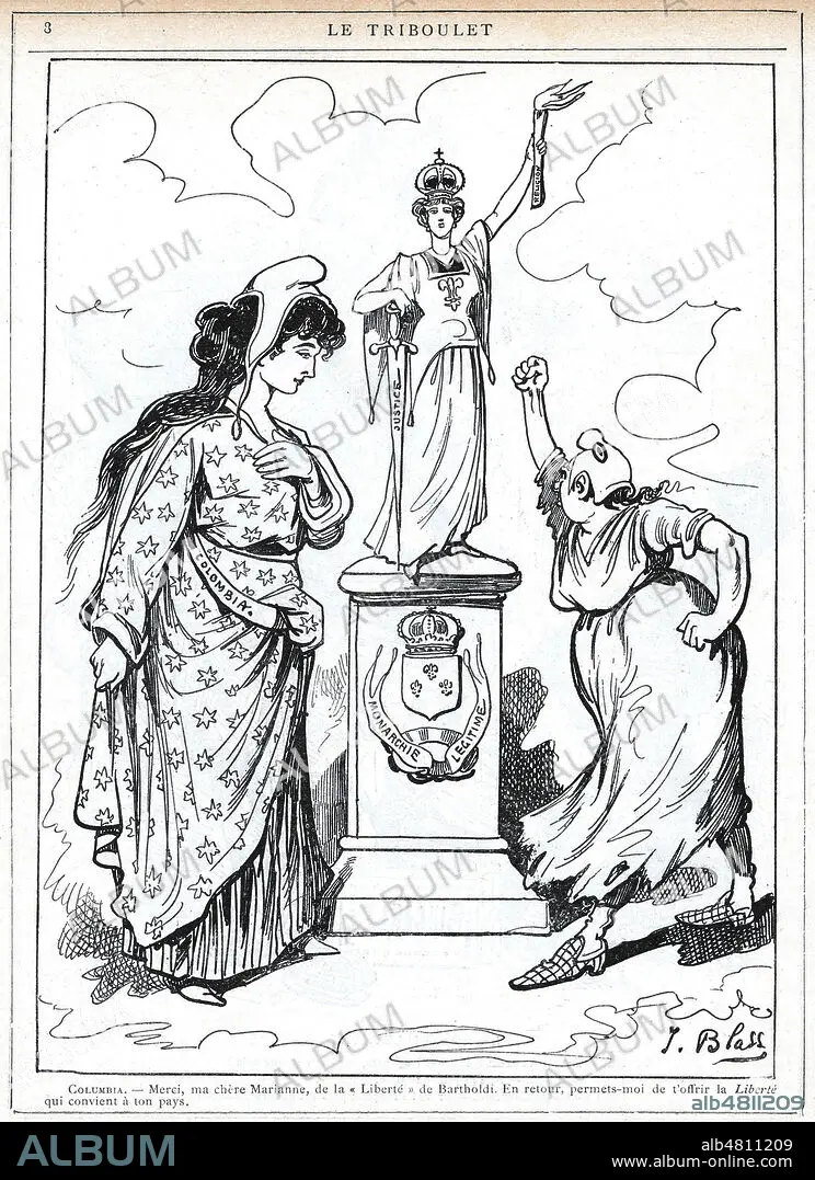 Légende: Colombia.- Merci ma chere Marianne, de la Liberte de BARTHOLDI. En retour, permets-moi de t'offrir la Liberte qui convient a ton pays (La Monarchie). Caricature de J.BLASS (1847-1892) pour la revue satirique royaliste Le Triboulet du 7 novembre 1886. Credit : Collection Kharbine-Tapabor.