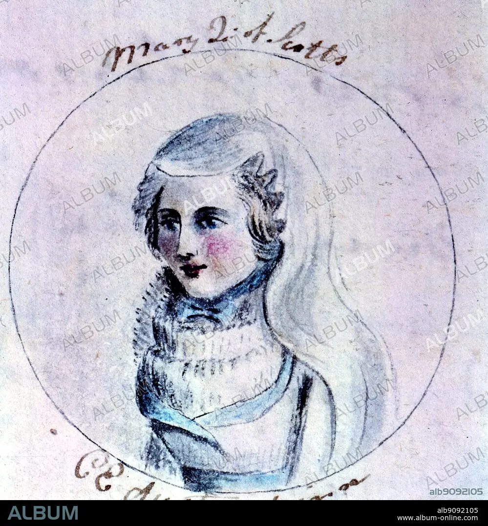 Mary Queen of Scotts. Watercolour sketches by Cassandra Austen: One of six sketches for Jane Austen's History of England, 1790. Cassandra Austen, was the elder sister of Jane Austen (1775-1817), to whom she was very close.