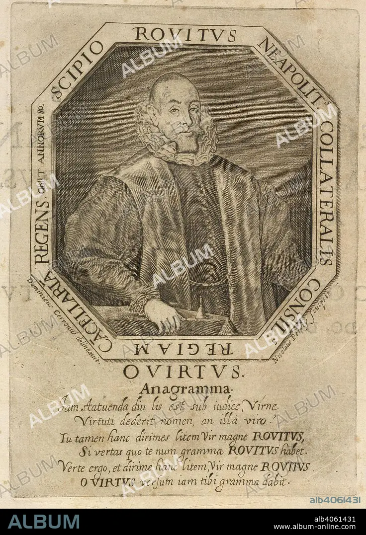 Portrait of the author, Scipio Rovitus. Luculenta Commentaria in singulas Regni Neap. Pragmaticas Sanctiones, cum declaratione juris communis per eas confirmati ... Neapoli, Italy 1637. Source: 1605/404 frontispiece. Language: Italian.