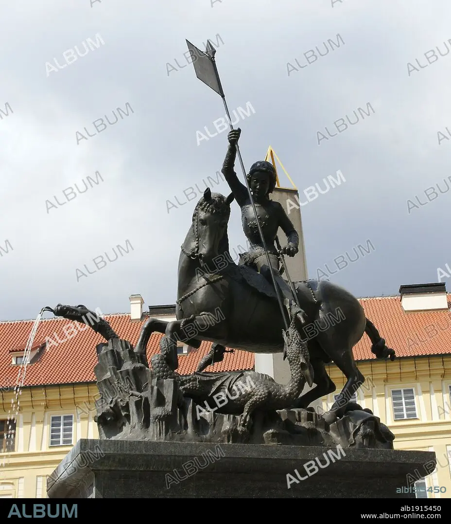 Czech Republic. Prague. Statue of St. George and a fountain. Gothic bronze statue was cast by George and Martin of Kluj. St. George killing a dragon. 1773. Prague Castle, Third Courtyard.