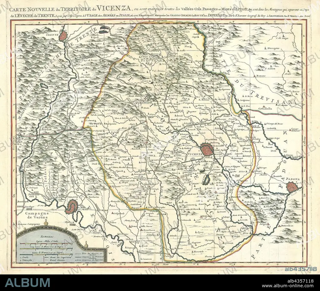 Map, Carte nouvelle du territoire de Vicenza, où sont marquées toutes les vallées, cols, passages et mines d'argent, qui sont dans les montagnes qui separent ce pays de l'éveché de Trente, Guillaume Sanson (-1703), Copperplate print.