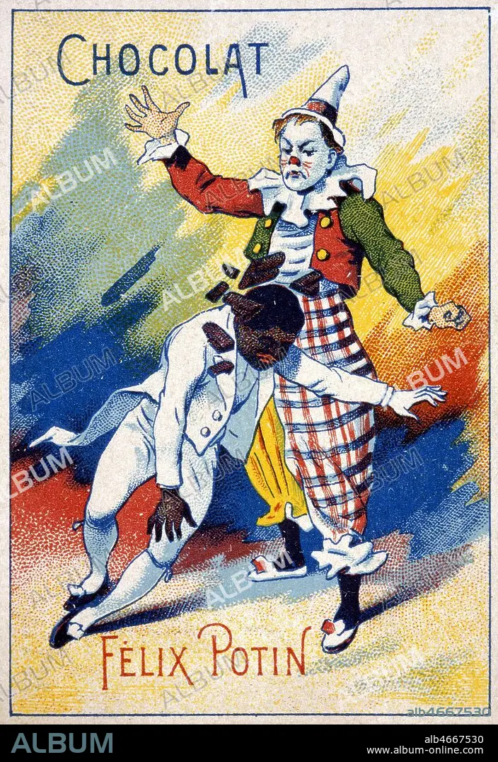 Chromo publicitaire pour du chocolat, mettant en scene les clowns FOOTIT (1864-1921) et CHOCOLAT (1868-1917). Marque Felix Potin. Credit Collection Kharbine Tapabor