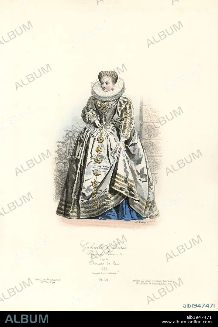 Gabrielle d'Estree, mistress to Henri IV, 1595. Handcoloured steel engraving by Hippolyte Pauquet after Thomas de Leu from the Pauquet Brothers' "Modes et Costumes Historiques" (Historical Fashions and Costumes), Paris, 1865. Hippolyte (b. 1797) and Polydor Pauquet (b. 1799) ran a successful publishing house in Paris in the 19th century, specializing in illustrated books on costume, birds, butterflies, anatomy and natural history.
