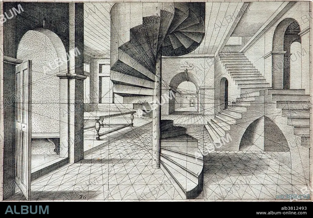 Hans Vredeman de Vries (1527-1607) was a Dutch Renaissance architect, painter, and engineer. He is known for his publication in 1583 on garden design and his books with many examples on ornaments (1565) and perspective (1604). Perspective, in context of vision and visual perception, is the way in which objects appear to the eye based on their spatial attributes; or their dimensions and the position of the eye relative to the objects. There are two main meanings of the term: linear perspective and aerial perspective. In linear perspective objects become more distant they appear smaller because their visual angle decreases. Aerial perspective refers to the effect on the appearance of an ordinary object of being viewed through the atmosphere. Perspective in the graphic arts, is an approximate representation, on a flat surface, of an image as it is seen by the eye. The artist uses intuitive, artistic, scientific, or technical skills to represent the phenomenon of the visual perception of perspective. The two most characteristic features of perspective are that objects are drawn: smaller as their distance from the observer increases, and/or foreshortened where the size of an object's dimensions along the line of sight are relatively shorter than dimensions across the line of sight.
