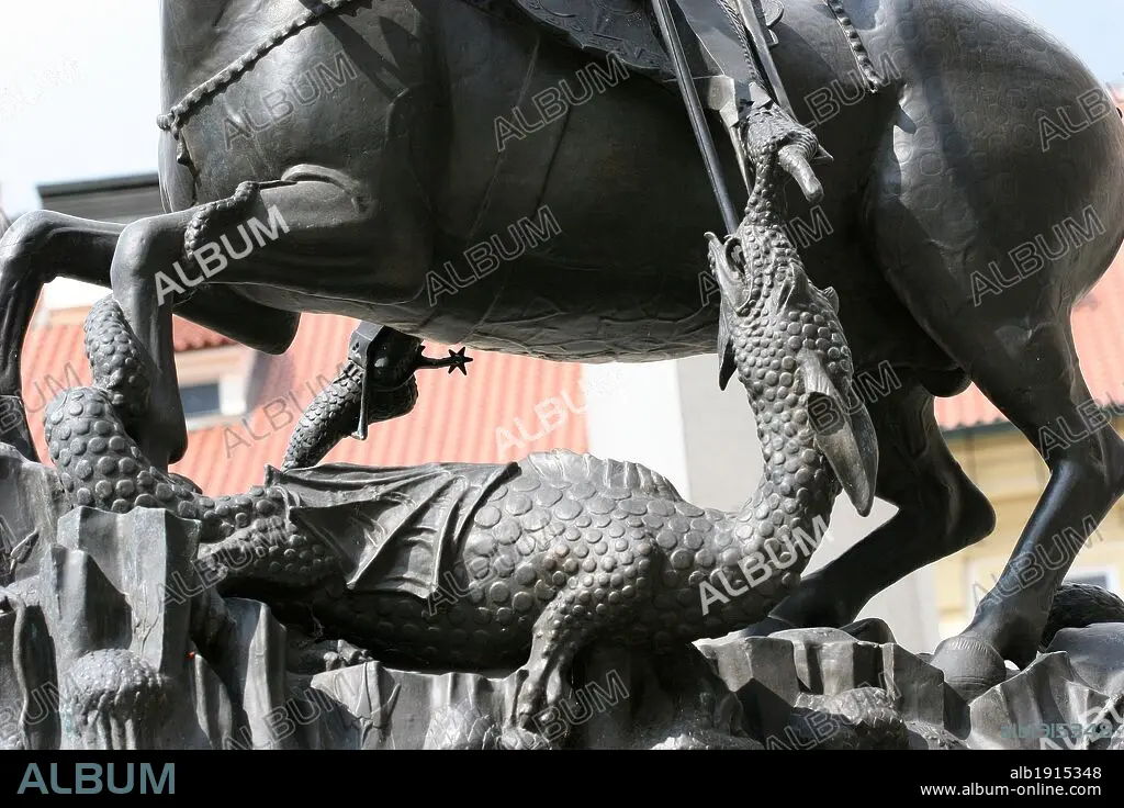 St.George killing a dragon. Detail. Gothic bronze statue, unique example of metal casting in 14th century. It was cast by George Martin and Kluj in 1373. The original statue is stored in the collections of the National Gallery and the actual is a copy from 1967. Prague Castle,Third Courtyard. Czech Republic.