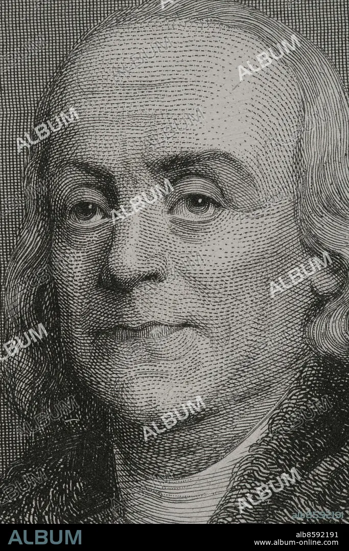 CHARLES GEOFFROY (1819-1882). FRENCH ENGRAVER.. Benjamin Franklin (1706-1790). American scientist, inventor and politician. In 1776 he wrote, with Jefferson and John Adams, the Declaration of Independence of the United States of America. Portrait. Engraving by Geoffroy. Detail. "Historia Universal", by César Cantú. Volume VI. 1857.