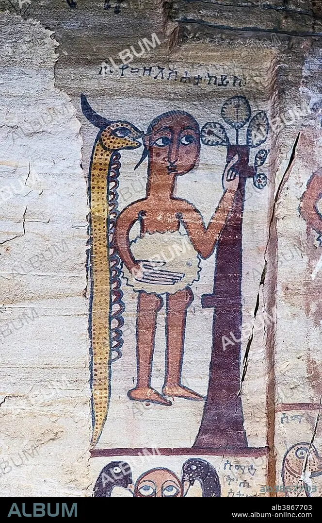 Eve with the inscription seduced by the serpent, fresco inside the rock church Maryam Qorqor, Gheralta, Tigray, Ethiopia