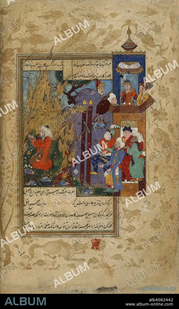 Ibrahim in the fire. Hadikat us-suada. Turkey, late 16th/early 17th century. Ibrahim sitting on the ground having been catapulted into the fire. On the command of God the fire became cold and a spring surrounded by flowers appeared. Ibrahim is shown sitting near the spring and flowering plants, encircled by flames. Men are pulling ropes to operate the catapult and Nimrud is watching from a balcony. A miniature painting from a manuscript of Hadikat us-suada, a history of the holy martyrs of the Prophet's family. Image taken from Hadikat us-suada. Originally published/produced in Turkey, late 16th/early 17th century. . Source: Or. 12009, f.15v. Language: Ottoman Turkish.