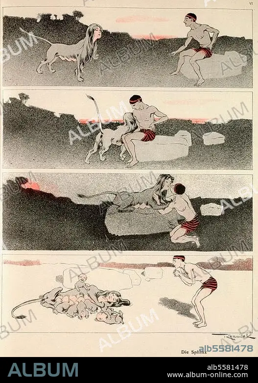 Légende: Mythologie / Sphinx. "Le Sphinx". (Caricature du tableau "Sphinx" de Franz von Stuck). Gravure sur bois coul. d'ap. dessin de Ferdinand von Reznicek (1869-1909). In : "Elle". Reznicek-Album, Munich (A.Langen) 1900, n° VI. Berlin, Sammlung Archiv für Kunst und Geschichte.