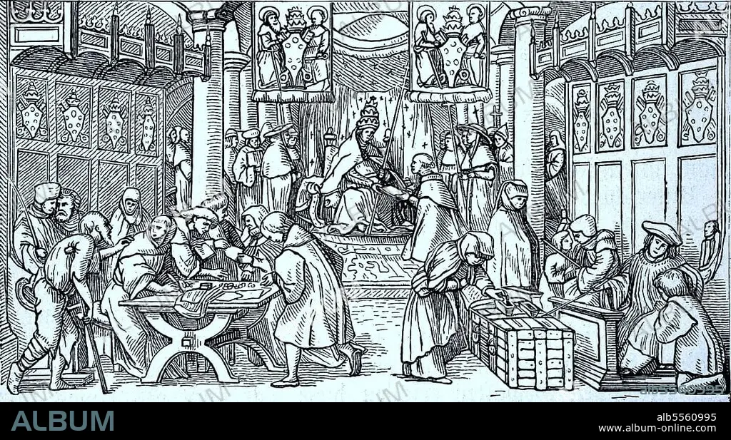 Ablassbriefe in einer Basler Kirche mit dem Wappen der Mediceer, Aus Angst vor dem Fegefeuer und vor Unvergebung kauften die Menschen Ablassbriefe, man sagte, dass man von seinen Sünden befreit würde, wenn man einen Ablassbrief kauft, digitale verbesserte Reproduktion eines Originaldrucks aus dem 19. Jahrhundert.