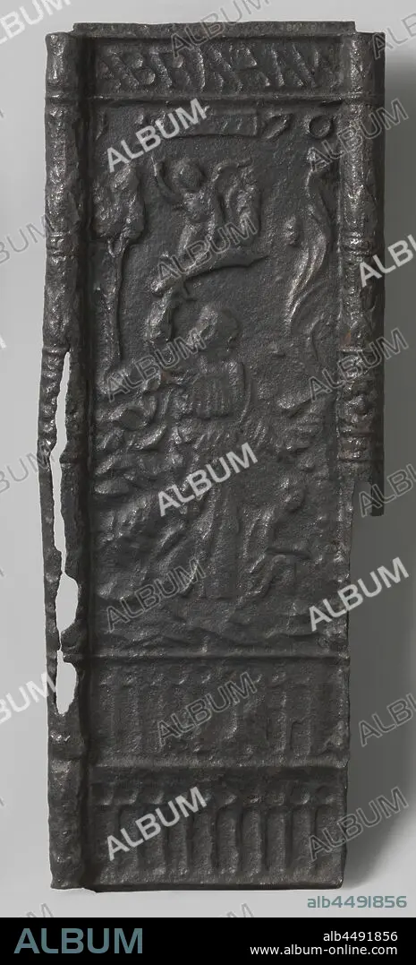 Heater plate with the sacrifice of Isaac, Heater plate of cast iron, divided into two zones. In the upper zone is an image of Abraham with a raised sword, ready to kill the kneeling Isaac in the lower right corner. The sword is stopped by a putto. Above it the year 1570 with a cartouche in between with a partially illegible inscription and the numbers 22, a reference to the Bible book from which this representation is derived (Genesis 22). At the very top of the text in italics, the inscription ABRAHAM. In the lower zone a grid of horizontal lines. The whole is closed on the sides with decorated pillars, the sacrifice of Isaac (Genesis 22), anonymous, Germany, in or after 1570 - c. 1575, iron (metal), founding, h 97.0 cm × w 38.0 cm × w 41 kg.