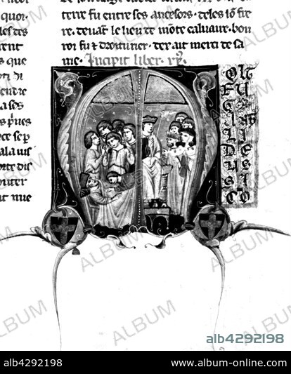 William of Tyre, "History of Deeds done beyond the Sea", Accra, ca. 1275, f° 241 (Book 20, Chapter 31) : Left: The mourning of Amaury I. Right: Count Raymond of Tripoli and his wife Eschiva presenting themselves to Baudoin IV. 13th. CrusadesParis, Bibliothèque Nationale