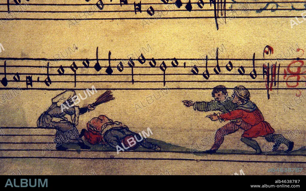 Un homme, fesses nues, se fait fouetter par sa femme. Enluminure tiree d'un recueil de chansons datant de 1542 (16e, 16eme, XVIe s.). Manuscrit conserve a la bibliotheque municipale de Cambrai. Ms 128. Credit : Collection JEAN VIGNE / KHARBINE-TAPABOR.