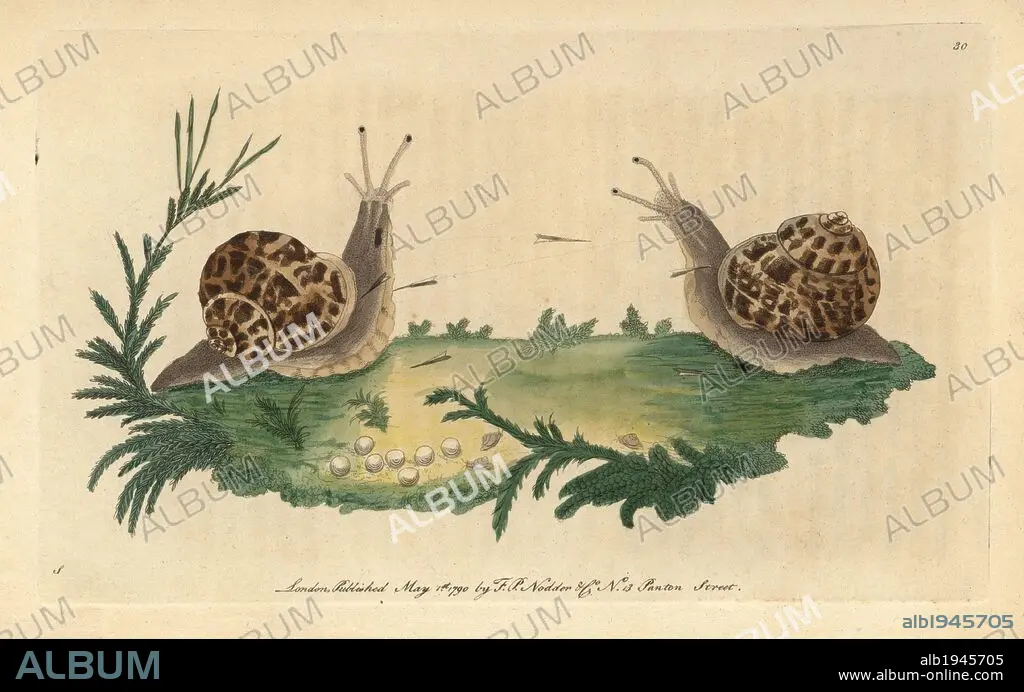 Garden snail. Helix aspersa (Helix hortensis). "When these animals are disposed to love, they signify their mutual wishes by launching several little darts (spicula) at each other. These darts are of a very sharp form, and of a horny substance, and the animals are provided with a little quiver or reservoir of them during the breeding season.". Illustration signed S (George Shaw).. Handcolored copperplate engraving from George Shaw and Frederick Nodder's "The Naturalist's Miscellany" 1790.. Frederick Polydore Nodder (1751~1801?) was a gifted natural history artist and engraver. Nodder honed his draftsmanship working on Captain Cook and Joseph Banks' Florilegium and engraving Sydney Parkinson's sketches of Australian plants. He was made "botanic painter to her majesty" Queen Charlotte in 1785. Nodder also drew the botanical studies in Thomas Martyn's Flora Rustica (1792) and 38 Plates (1799). Most of the 1,064 illustrations of animals, birds, insects, crustaceans, fishes, marine life and microscopic creatures for the Naturalist's Miscellany were drawn, engraved and published by Frederick Nodder's family. Frederick himself drew and engraved many of the copperplates until his death. His wife Elizabeth is credited as publisher on the volumes after 1801. Their son Richard Polydore (1774~1823) was responsible for the plates signed RN or RPN. Richard exhibited at the Royal Academy and became botanic painter to King George III. The illustrations are characterized by vivid colouring, fine detail, and a certain posed stiffness in the ornithological portraits, perhaps because they were sketched from dead specimens.