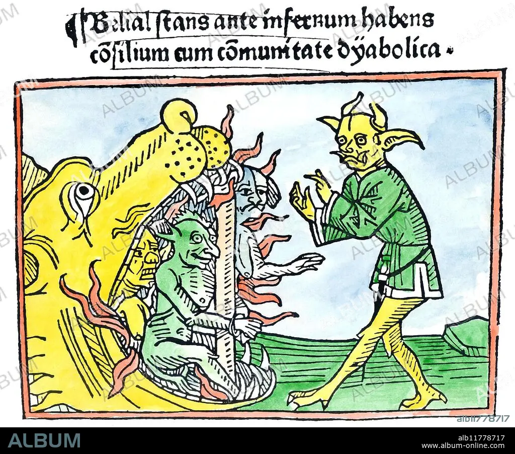 DEMONS - BELIAL - HELL. The demon Belial consulting with his brother-demons, at the Gate of Hell. From Jacobus de Teramo, Das Buch Belial, 1473. The other woodcuts in this work make it clear that Belial is one of the demons from the Solomonic tradition - indeed, some cuts show Belial and other demons gathered before Solomon, as though he were there appointed ruler. In one image, Belial dances before Solomon, as though in homage.