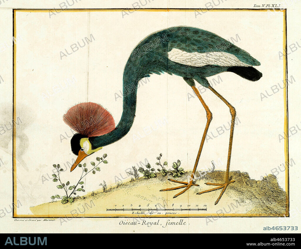 planche zoologique : 'Oiseau royal, femelle': grue. Estampe de Francois Nicolas MARTINET (1731-1792) vers 1770 tiree de son 'Histoire des oiseaux'. Credit: Collection MX/KHARBINE-TAPABOR.