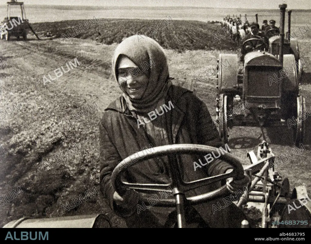 Femme conduisant un tracteur dans un kolkhoze. Illustration tiree de l'ouvrage de E. GLAESER et F.C. WEISKOPF 'La Russie au travail', publie vers 1935. Credit : Jean Vigne/KHARBINE-TAPABOR.