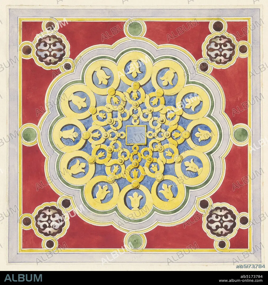 Design for Decorative Panel for July Festival Architecture, Félix-Jacques Duban, French, 1798 - 1870, Brush and watercolor, gouache, black wash, pen and black ink, graphite on cream paper mounted on cream laid paper, Design for a hexagonal column capital with red, blue, and gold, geometric Arabic-style ornament., 1835, architecture, Drawing, Drawing