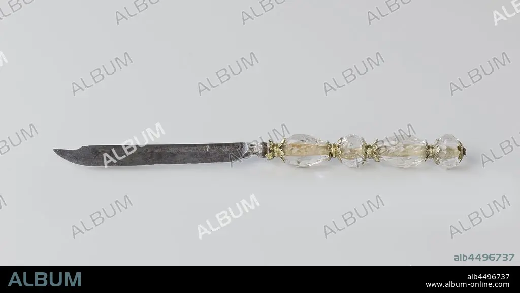 Knife of polished rock crystal with gold-plated silver, Knife of a cutlery set consisting of knife, fork and spoon, of polished rock crystal, mounted in sections on double, decorated gilt silver rosettes., anonymous, Freiburg, 1600 - 1650, silver (metal), h 20.0 cm.