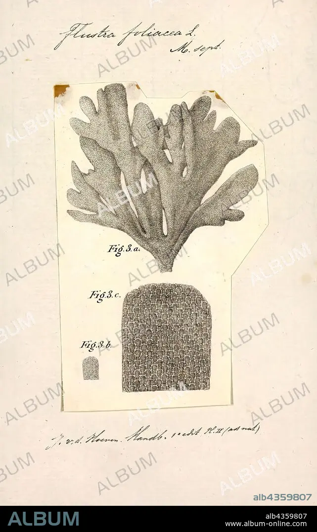 Flustra foliacea, Print, Flustra foliacea is a species of bryozoans found in the northern Atlantic Ocean. It is a colonial animal that is frequently mistaken for a seaweed. Colonies begin as encrusting mats, and only produce loose fronds after their first year of growth. They may reach 20 cm (8 in) long, and smell like lemons. Its microscopic structure was examined by Robert Hooke and illustrated in his 1665 work Micrographia.