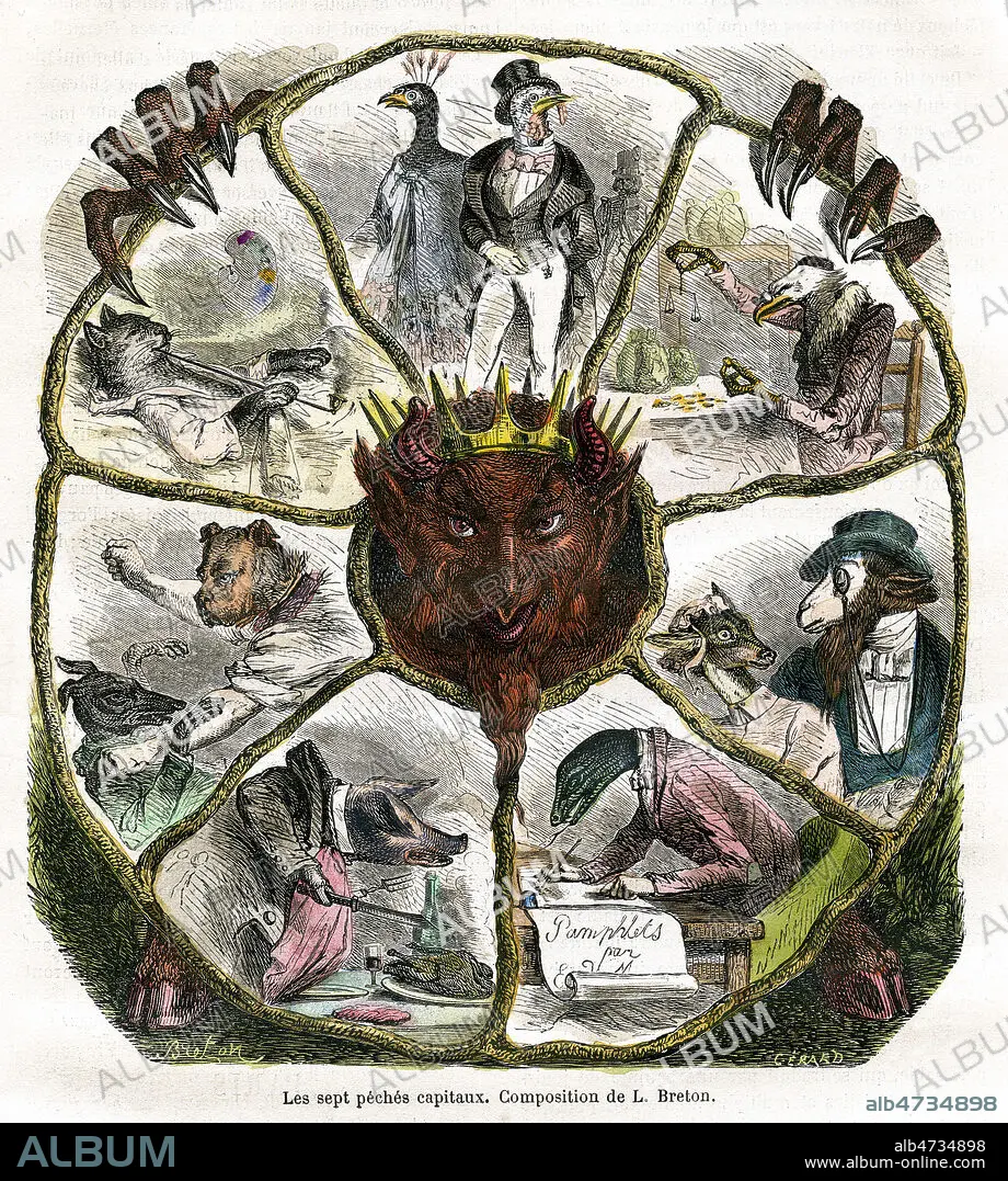 Les sept peches capitaux. (orgueil, avarice, luxure, envie, gourmandise, colere, paresse). Illustration de Louis BRETON (19 s.) pour La Semaine des Familles du 2 fevrier 1878. Mise en couleur par nos soins. Credit : Coll. Jonas/KHARBINE-TAPABOR.