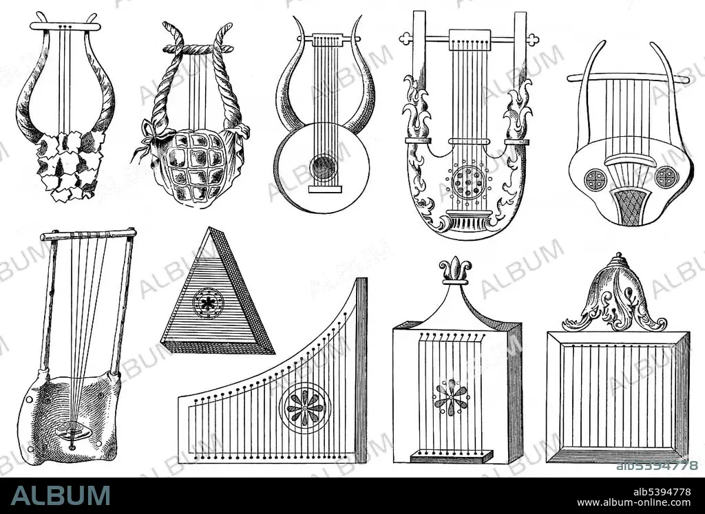 Historical drawing, various forms of the lyre, ancient string instruments from ancient Greece, the Roman Empire and Africa