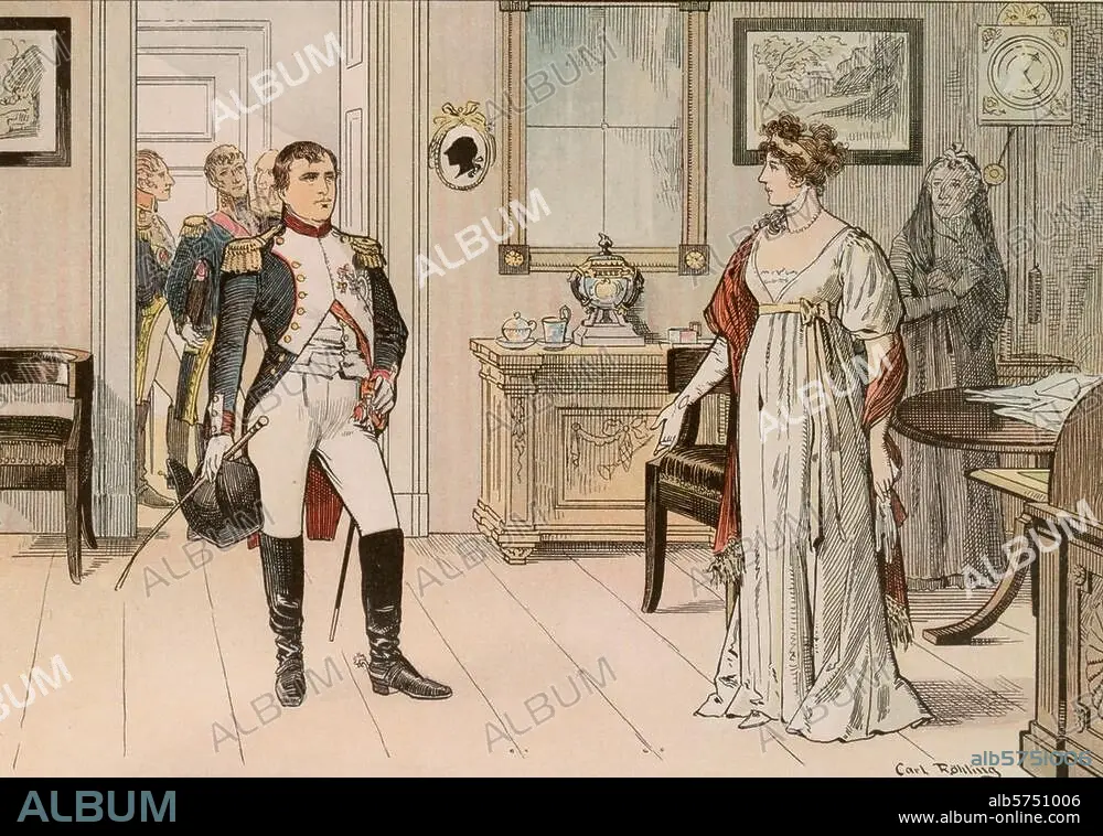 Légende: Napoléon Ier Bonaparte, empereur des Français (1804) ; 1769-1821. "La reine Louise et Napoléon à Tilsit" (6 juin 1807 : la reine Louise essaie, en vain, d'attendrir Napoléon sur le sort de la Prusse). Imp. coul. d'ap. C.Röhling (1849-1922). In : Die Hohenzollern in Wort und Bild, Berlin (M.Oldenbourg), p. 39. Berlin, Sammlung Archiv für Kunst und Geschichte.