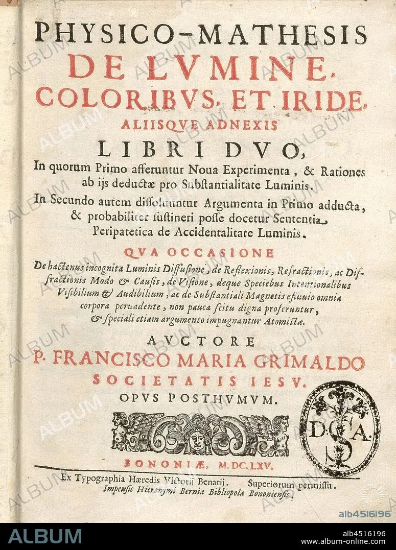 Title page on Francesco Maria Grimaldis 'Physico-mathesis de lumine ...' 2, Title page on Francesco Maria Grimaldis 'Physico-mathesis de lumine ...' from the 17th century, title page, 1665, Francesco Maria Grimaldi: Physico-mathesis de lumine, coloribus et iride [...]. Bononiae: ex typographia haeredis Victorii Benatii. Impensis Hieronymi Berniae, 1665.