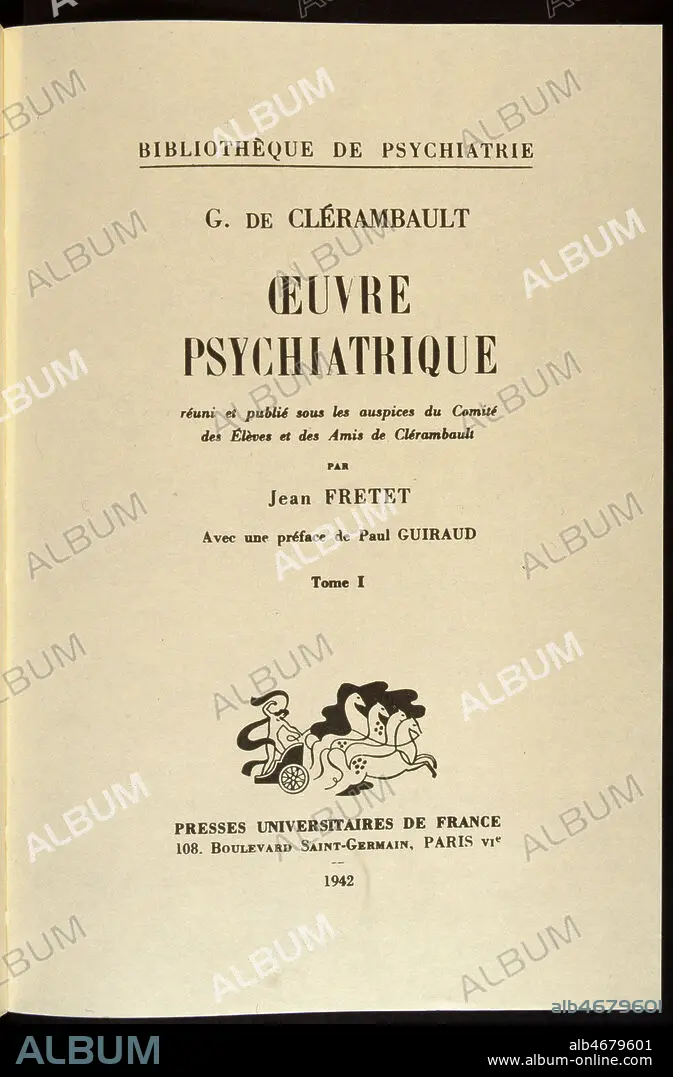 Légende: Page de titre de l'ouvrage de Gaetan GATIAN DE CLERAMBAULT (1872-1934) 'Oeuvres psychiatriques', edition de 1942. Credit : Jean Vigne/KHARBINE-TAPABOR.