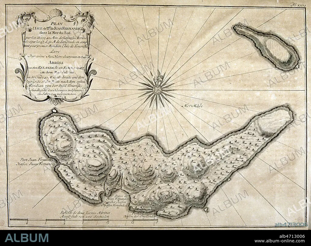 Carte de l'ile de Juan Fernandez (ile de Robinson Crusoe). Carte geographique tiree de l'ouvrage 'Voyage historique de l'Amerique meridoniale' par Don George JUAN et Don Antoine de ULLOA, publie en 1752. (18e, 18eme s., XVIIIeme s.) Ouvrage conserve a la bibliotheque municipale de Versailles. Credit : Collection JEAN VIGNE / KHARBINE-TAPABOR.