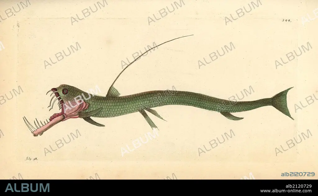 Sloane's viperfish, Chauliodus sloani. Illustration drawn and engraved by Richard Polydore Nodder. Handcolored copperplate engraving from George Shaw and Frederick Nodder's "The Naturalist's Miscellany," London, 1798. Most of the 1,064 illustrations of animals, birds, insects, crustaceans, fishes, marine life and microscopic creatures were drawn by George Shaw, Frederick Nodder and Richard Nodder, and engraved and published by the Nodder family. Frederick drew and engraved many of the copperplates until his death around 1800, and son Richard (1774~1823) was responsible for the plates signed RN or RPN. Richard exhibited at the Royal Academy and became botanic painter to King George III.