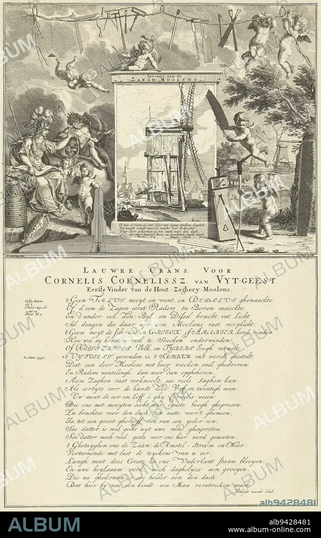 Tribute to Cornelis Corneliszoon van Uitgeest, the inventor of the sawmill, 1592 According to the caption, the mill was invented at Uitgeest and built in Zaandam Allegory with a depiction of an old sawmill including a verse surrounded by Minerva, Aeolus and putti At the top, putti stretch a cord with all kinds of carpenter's tools Beneath the scene is a 24-line verse in Dutch, Homage to Cornelis Corneliszoon van Uitgeest, the inventor of the sawmill, 1592 Invention of the Zaegh-Moolens Lauw're-Crans, For Cornelis Cornelissz van Uyt-geest First finder of the Hout-Zaghery-Moolens , print maker: Jan Schenk, (mentioned on object), Adolf van der Laan, (mentioned on object), Hendrik Jacobsz Soeteboom, (mentioned on object), Northern Netherlands, 1708 - 1752, paper, etching, engraving, h 444 mm × w 277 mm.