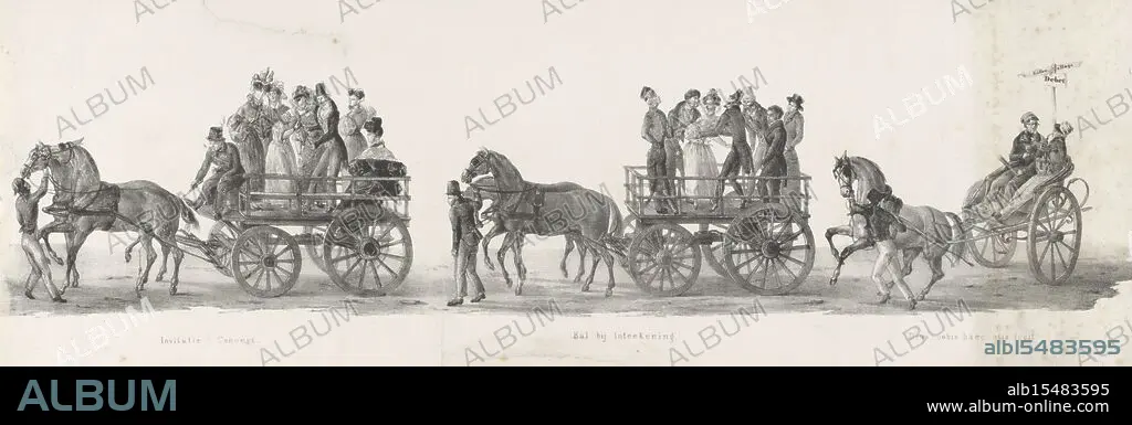 Leiden, Mulder, Aeschinus Saagmans, Netherlands, Springer, Leendert (I), The individual performances, which the procession, held by HH Students of Leiden University on the 9th of February: 1835, closed, Invitation Concert, Ball by Intetekening, Deus nobis haec otia fecit, Invitation to a concert, the ball and drunk students, 1835, verso - stamped, Sheet with three carts. On the first cart a man invites women to a concert. On the second cart a woman surrounded by men at a ball. At the back a gig with two drunk students. Fourth plate in the procession held by students of the Leiden University to celebrate the dies natalis of the university on 9 February 1835., print, prent, prints, Frederik Muller Historieplaten, height 198 mm, width 568 mm, Dutch, 1789-03-05 - 1871-10-29, print maker, printmaker, 1835 - 1835, paper, papier, lithografie (techniek), 1804 - 1841-04-25, intermediary draughtsman.