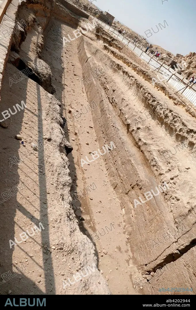 Solar Boat pit. Giza Pyramids Plateau. Egypt. built to hold the Khufu ship. (Solar Ship). from Ancient Egypt. was sealed into a pit in the Giza pyramid complex. at the foot of the Great Pyramid of Giza. around 2500 BC. The ship now is preserved in the Giza Solar boat museum. The ship was almost certainly built for Khufu (King Cheops). the second pharaoh of the Fourth Dynasty of the Old Kingdom of Egypt.