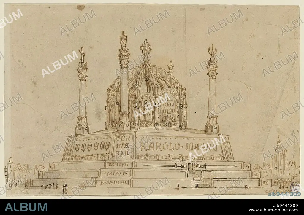 Tombeau de Charlemagne, Mayeux, Pierre-Henri, Draughtsman, 2nd half of the 19th century, Drawing, Graphic Arts, Drawing, Pen, Brown ink, Black ink, White highlights, Gouache, Paper, Height: 15.8 cm, Width: 23.9 cm.