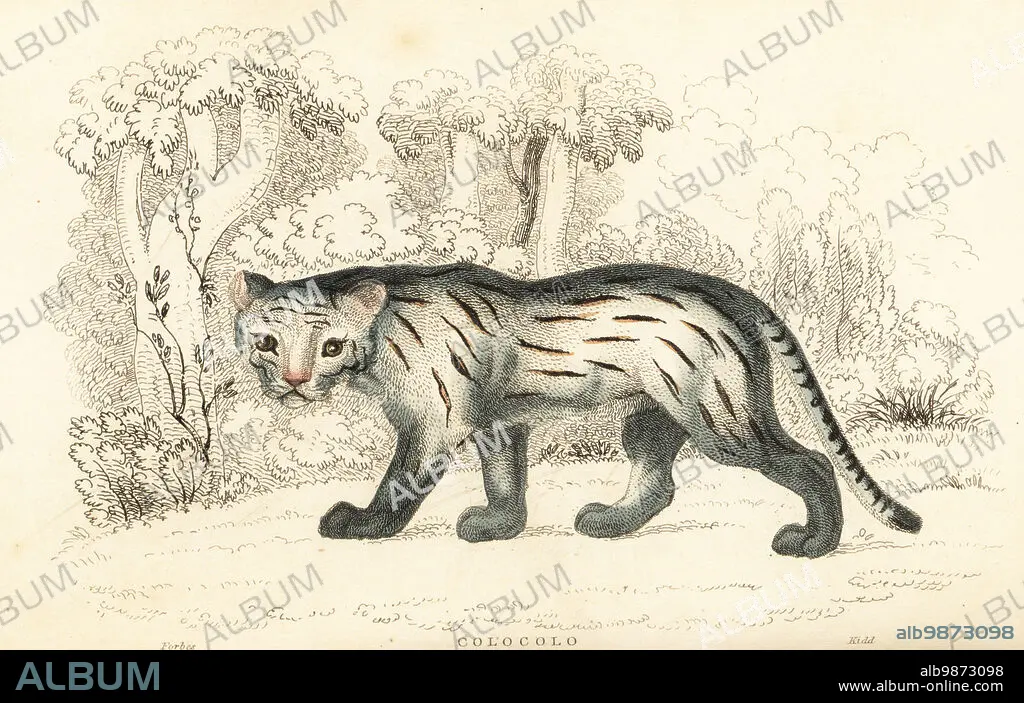 Pampas cat or pantanal, Leopardus colocola. (Colocolo, Felis colocolo, Molina). Handcoloured steel engraving by Joseph Kidd after an illustration by Alexander Forbes from William Rhinds The Miscellany of Natural History: Feline Species, edited by Sir Thomas Dick Lauder, Fraser & Co., Edinburgh, Scotland, 1834.