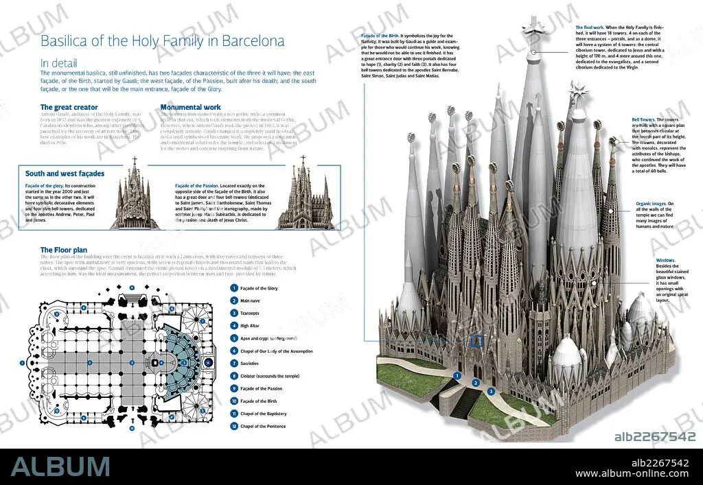 Infographic of the Basilica of the Holy Family or the Basilica and Expiatory Church of the Holy Family, or simply, Holy Family. A great Catholic church in Barcelona (Spain), designed by Catalan architect Antoni Gaudi. It is his masterpiece and the maximum exponent of Catalan modernist architecture.