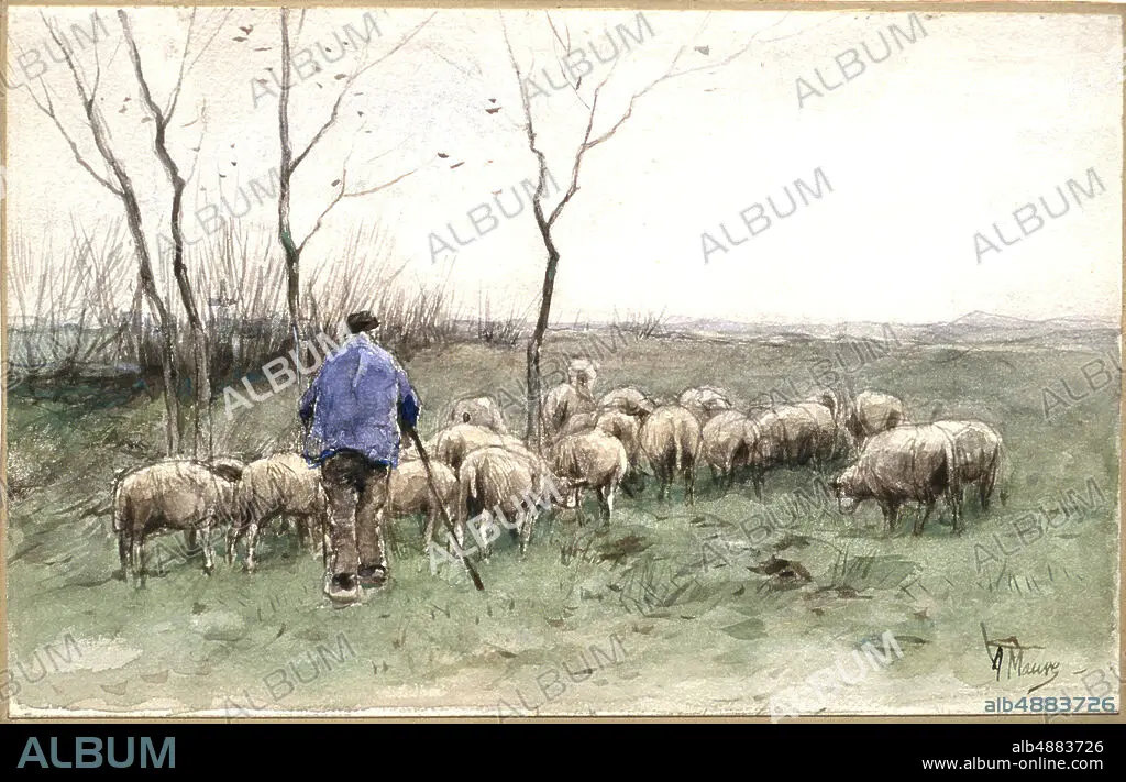Anton Mauve, Dutch, 18381888, A Shepherd and His Flock, ca. 1885, Watercolor on paper, Overall: 7 7/16 x 11 3/4 in. (18.9 x 29.8 cm).
