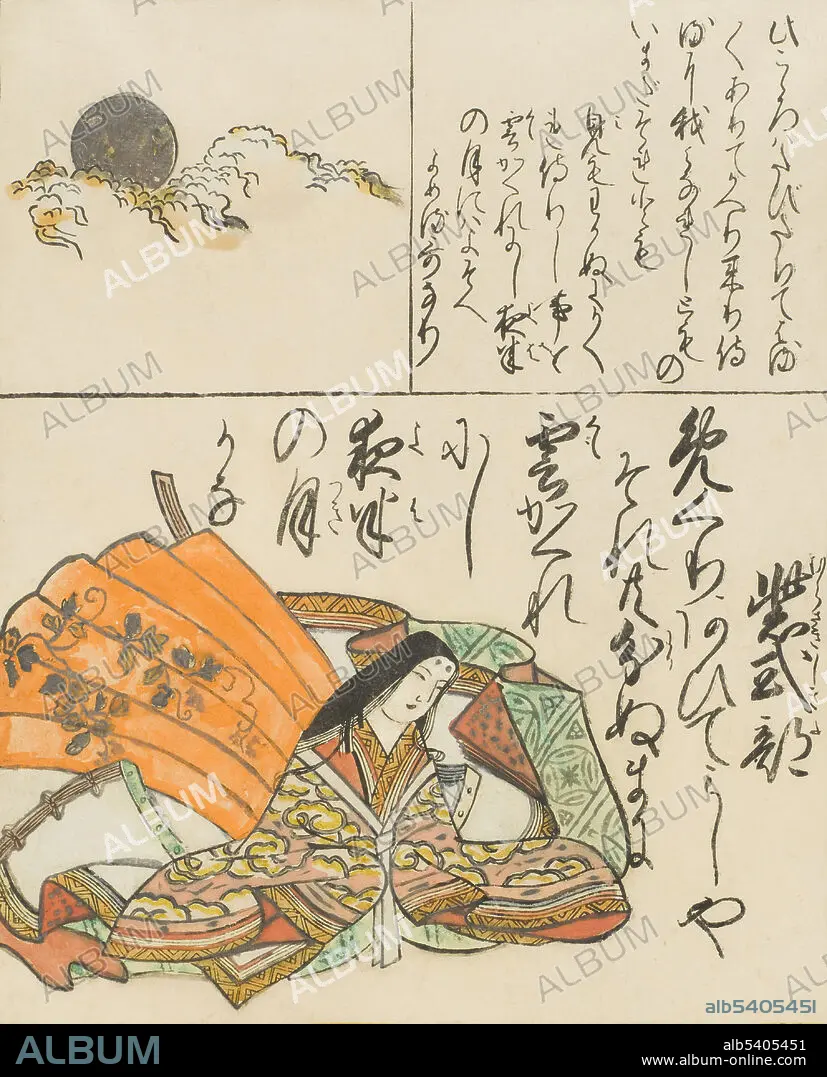 Series: One Hundred Poems by One Hundred Poets. Murasaki Shikibu (973/978 – 1014/1031) was a Japanese novelist. Heian women were traditionally excluded from learning Chinese (the written language of government), but her father encouraged her. It is uncertain when she began to write The Tale of Genji. In about 1005, Murasaki was invited to serve as a lady-in-waiting to Empress Shoshi at the Imperial court. She continued to write, adding scenes from court life to her work. Within a decade of its completion, Genji was distributed throughout the provinces; within a century it was recognized as a classic of Japanese literature. Attributed to Hishikawa Moronobu, 1670 (cropped and cleaned).