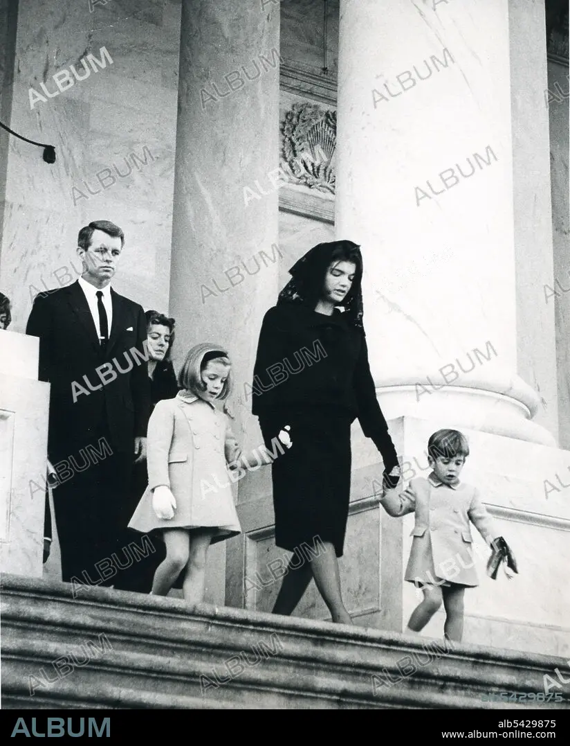 Jacqueline Kennedy, with her children, Caroline and John Jr., leaving the U.S. Capitol after brief service in the Capitol Rotunda. November 24, 1963. Abbie Rowe photographer.