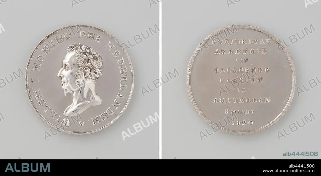 Establishment of the Royal Academy of Visual Arts in Amsterdam, in honor of Willem I Frederik, King of the Netherlands, Silver Medal. Front: man's bust inside the inside. Reverse: inscription, Amsterdam, Willem I Frederik (King of the Netherlands), Rijksakademie van Beeldende Kunsten, anonymous, Netherlands, 1820, silver (metal), striking (metalworking), d 4.2 cm × w 34.94 gr.